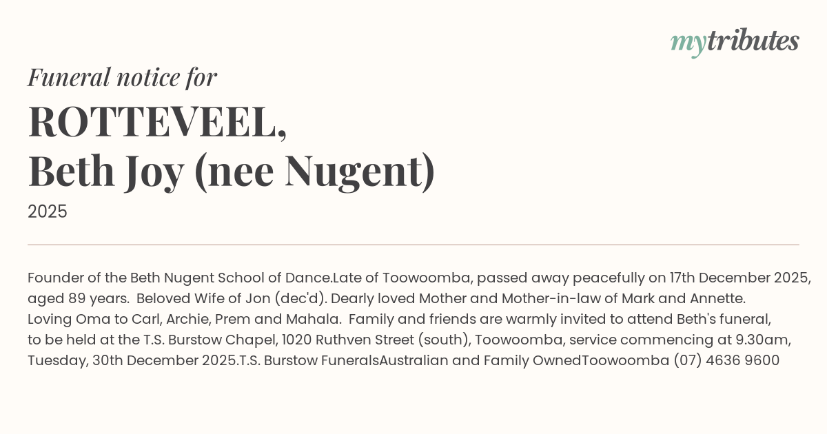 Family and friends are warmly invited to attend Beth's funeral, to be held at the T.S. Burstow Chapel, 1020 Ruthven Street (south), Toowoomba, service commencing at 9.30am, Tuesday, 30th December 2025.