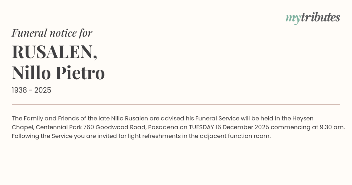 12°CThe Family and Friends of the late Nillo Rusalen are advised his Funeral Service will be held in the Heysen Chapel, Centennial Park 760 Goodwood Road, Pasadena on TUESDAY 16 December 2025 commencing at 9.30 am.