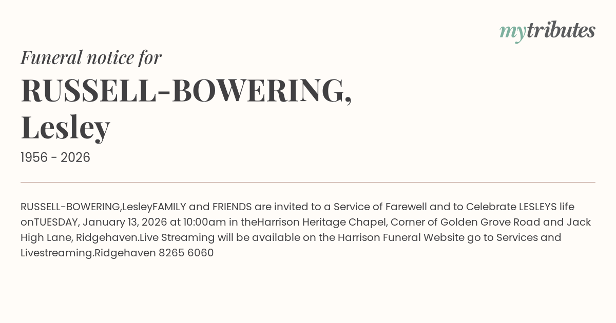 Live Streaming will be available on the Harrison Funeral Website go to Services and Livestreaming.