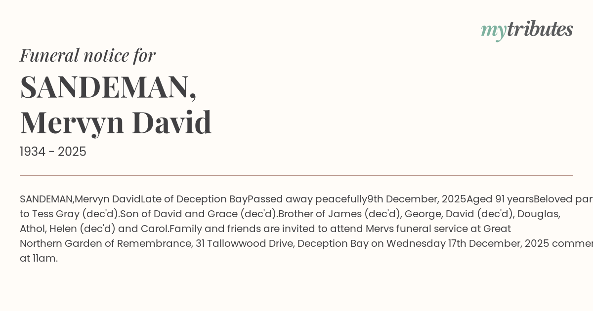 Family and friends are invited to attend Merv’s funeral service at Great Northern Garden of Remembrance, 31 Tallowwood Drive, Deception Bay on Wednesday 17th December, 2025 commencing at 11am.