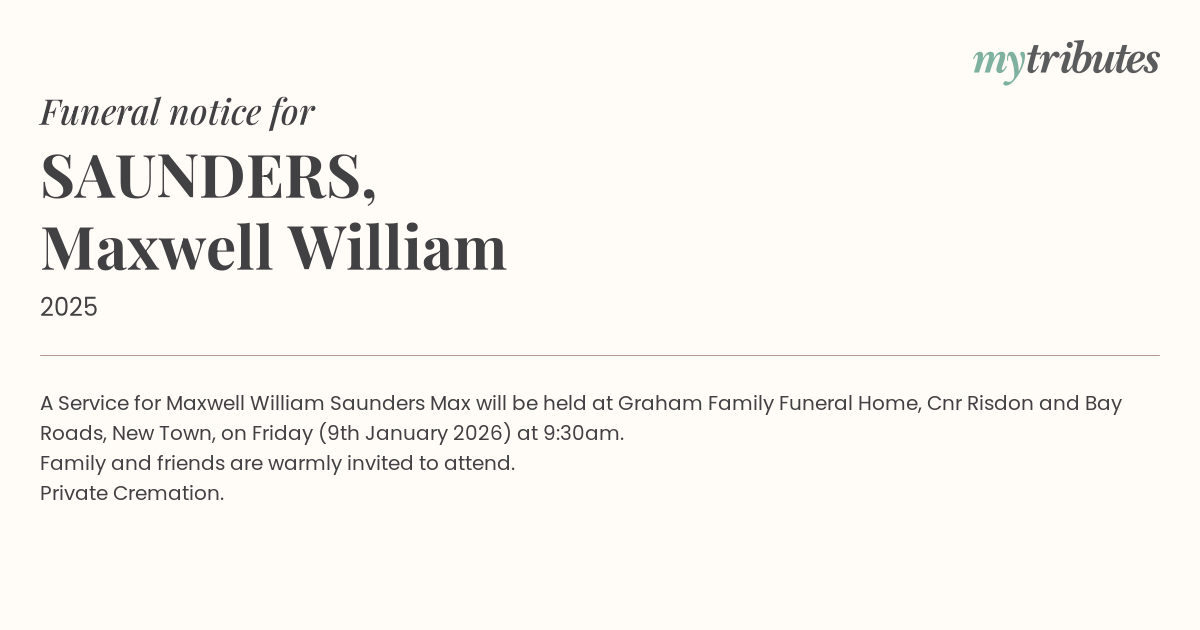 12°CA Service for Maxwell William Saunders ‘Max’ will be held at Graham Family Funeral Home, Cnr Risdon and Bay Roads, New Town, on Friday (9th January 2026) at 9:30am.
