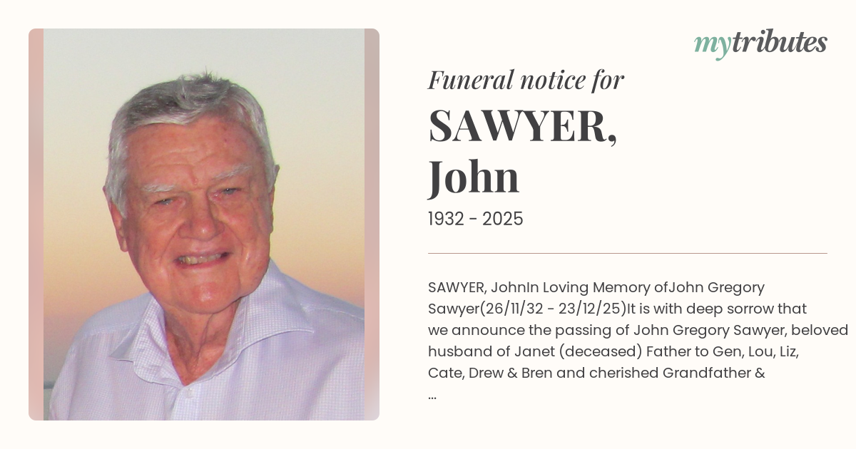 It is with deep sorrow that we announce the passing of John Gregory Sawyer, beloved husband of Janet (deceased) Father to Gen, Lou, Liz, Cate, Drew & Bren and cherished Grandfather & Great Grandfather to all of their families