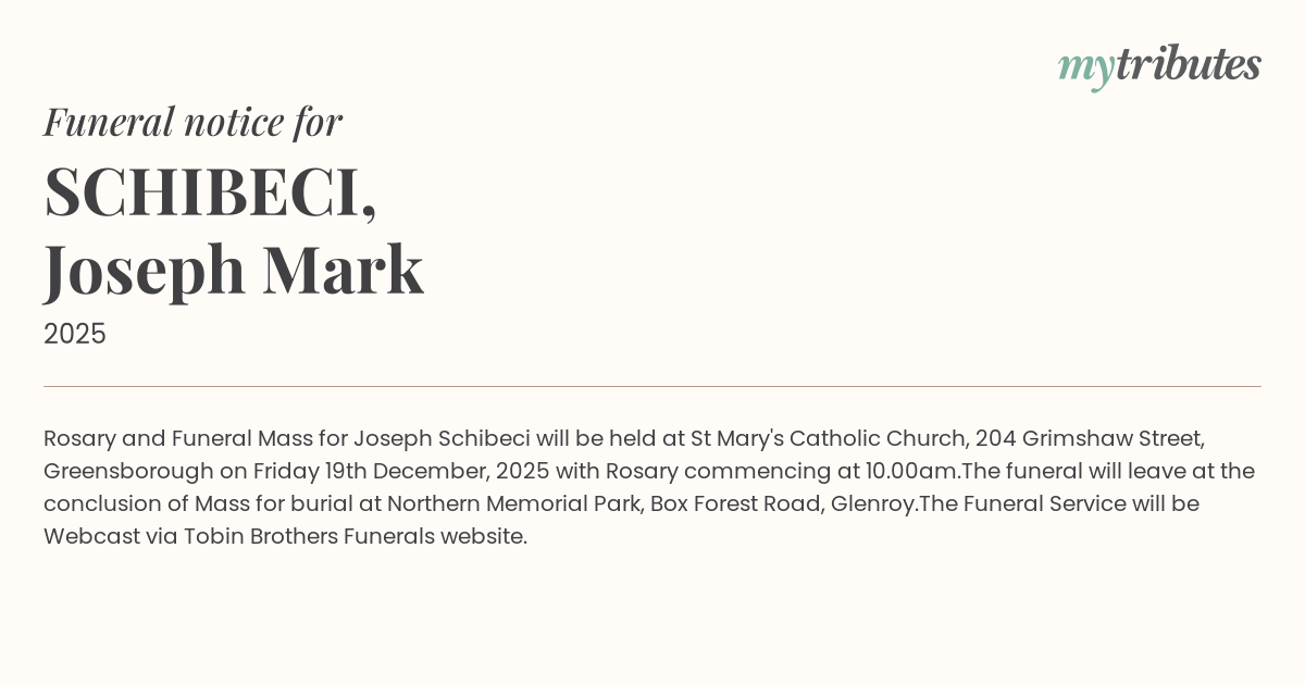 12°CRosary and Funeral Mass for Joseph Schibeci will be held at St Mary's Catholic Church, 204 Grimshaw Street, Greensborough on Friday 19th December, 2025 with Rosary commencing at 10.00am.