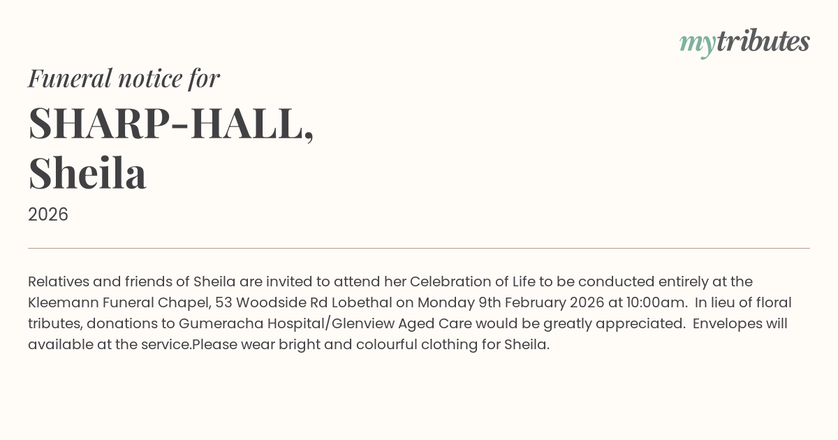12°CRelatives and friends of Sheila are invited to attend her Celebration of Life to be conducted entirely at the Kleemann Funeral Chapel, 53 Woodside Rd Lobethal on Monday 9th February 2026 at 10:00am. In lieu of floral tributes, donations to Gumeracha Hospital/Glenview Aged Care would be greatly appreciated. Envelopes will available at the service.