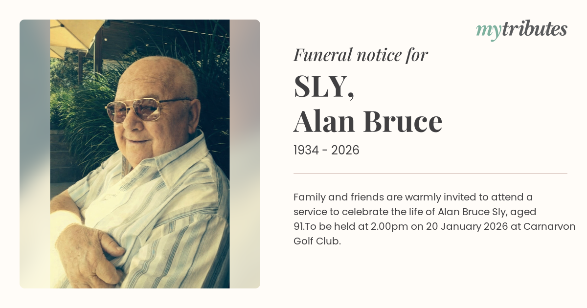 12°CFamily and friends are warmly invited to attend a service to celebrate the life of Alan Bruce Sly, aged 91.