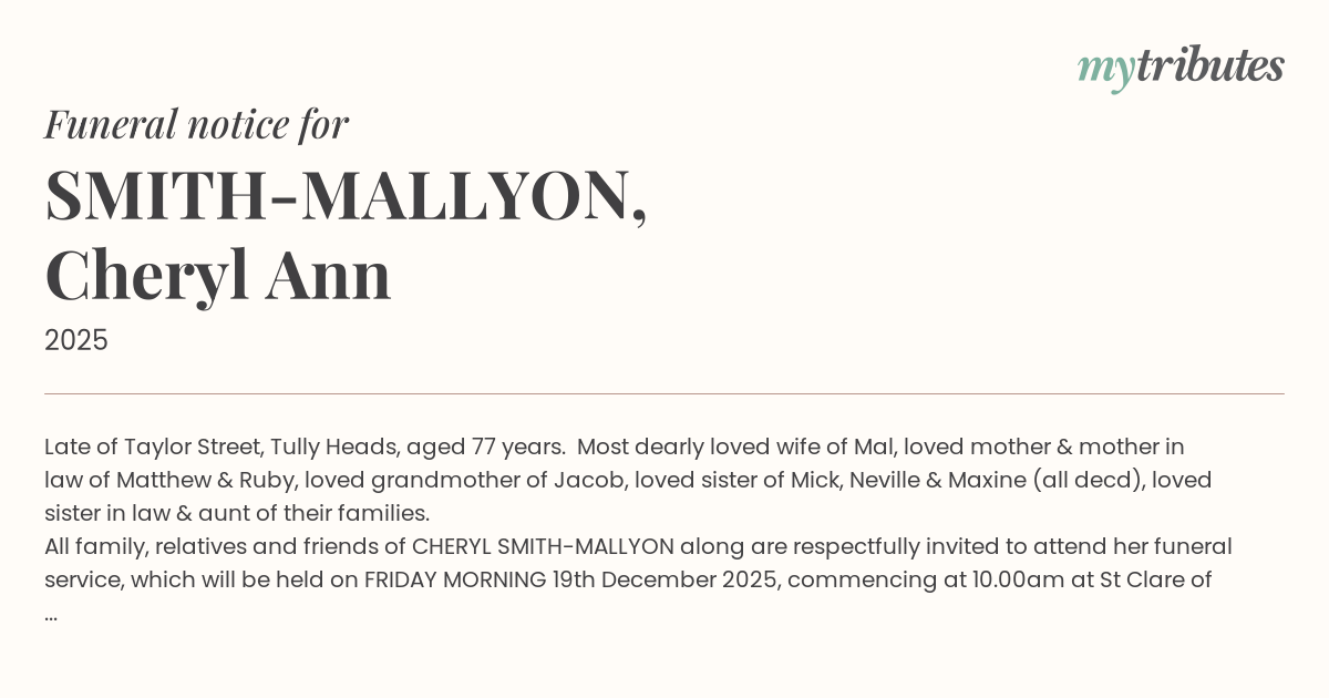 All family, relatives and friends of CHERYL SMITH-MALLYON along are respectfully invited to attend her funeral service, which will be held on FRIDAY MORNING 19th December 2025, commencing at 10.00am at St Clare of Montefalco Catholic Church, Mars Street, Tully, followed by interment at the New Tully Lawn Cemetery.