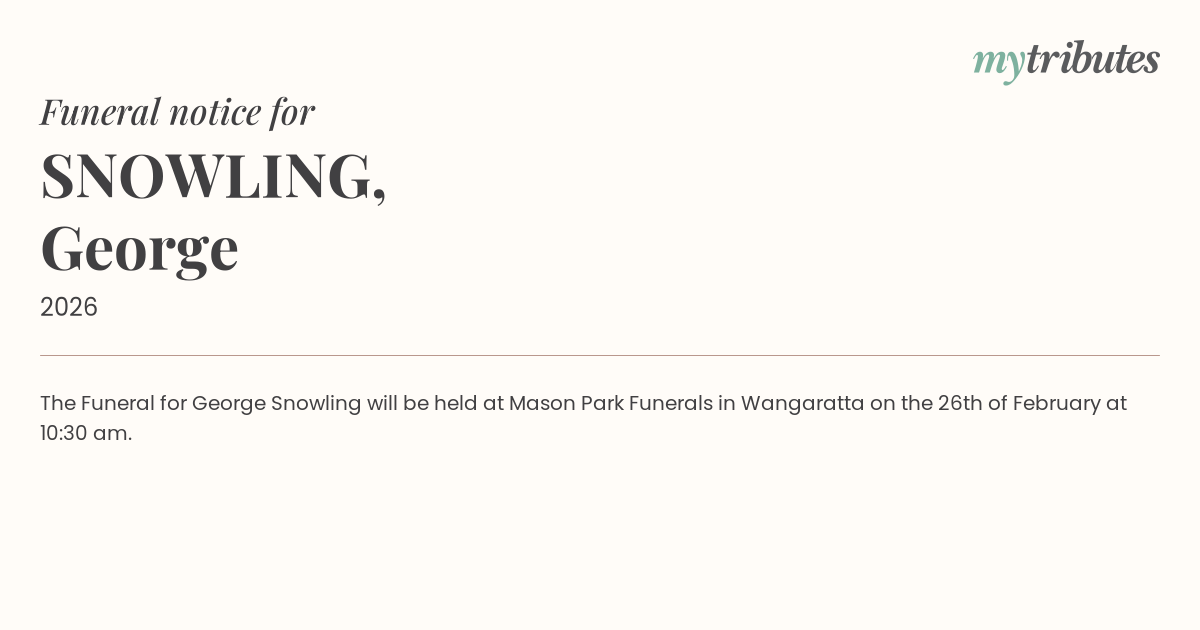 12°CThe Funeral for George Snowling will be held at Mason Park Funerals in Wangaratta on the 26th of February at 10:30 am.