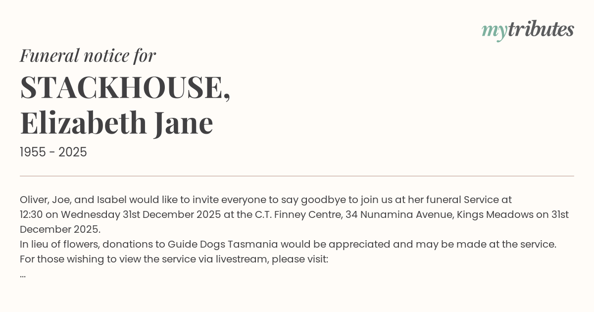 Oliver, Joe, and Isabel would like to invite everyone to say goodbye to join us at her funeral Service at 12:30 on Wednesday 31st December 2025 at the C.T. Finney Centre, 34 Nunamina Avenue, Kings Meadows on 31st December 2025.