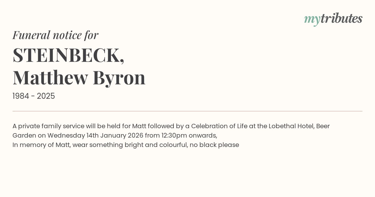 12°CA private family service will be held for Matt followed by a Celebration of Life at the Lobethal Hotel, Beer Garden on Wednesday 14th January 2026 from 12:30pm onwards,