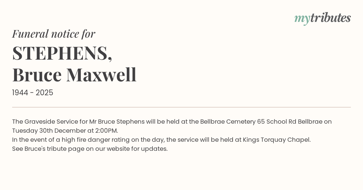 12°CThe Graveside Service for Mr Bruce Stephens will be held at the Bellbrae Cemetery 65 School Rd Bellbrae on Tuesday 30th December at 2:00PM.
