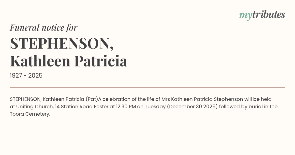 A celebration of the life of Mrs Kathleen Patricia Stephenson will be held at Uniting Church, 14 Station Road Foster at 12:30 PM on Tuesday (December 30 2025) followed by burial in the Toora Cemetery.
