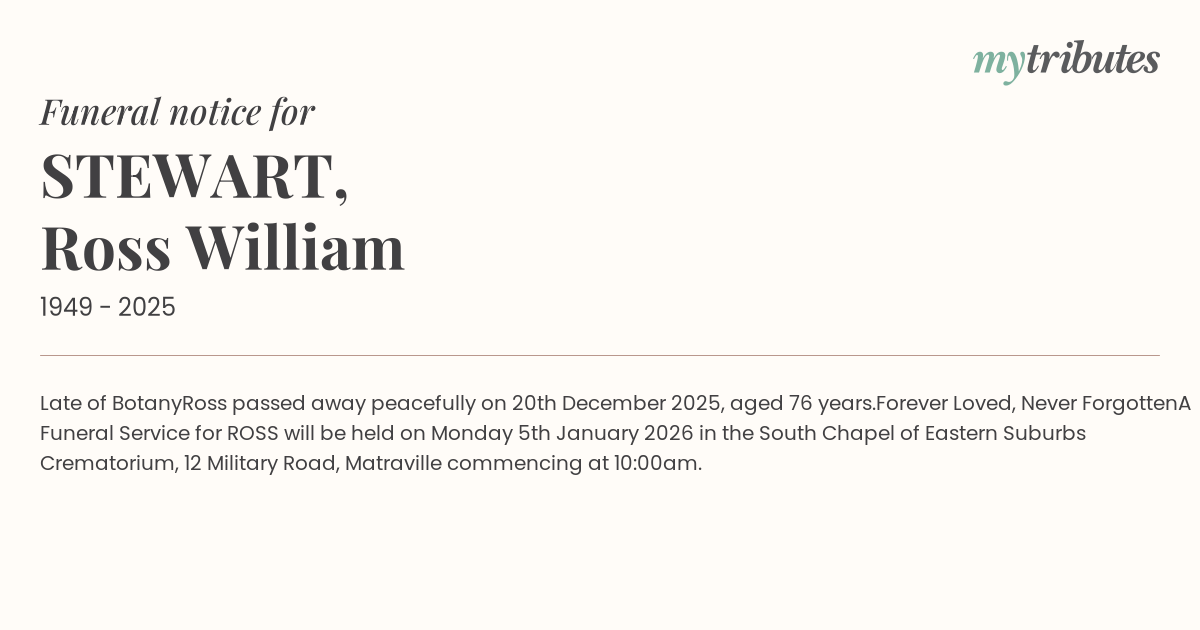 A Funeral Service for ROSS will be held on Monday 5th January 2026 in the South Chapel of Eastern Suburbs Crematorium, 12 Military Road, Matraville commencing at 10:00am.