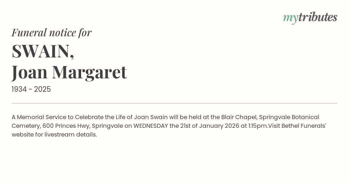 12°CA Memorial Service to Celebrate the Life of Joan Swain will be held at the Blair Chapel, Springvale Botanical Cemetery, 600 Princes Hwy, Springvale on WEDNESDAY the 21st of January 2026 at 1:15pm.
