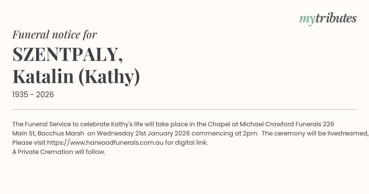 12°CThe Funeral Service to celebrate Kathy's life will take place in the Chapel at Michael Crawford Funerals 226 Main St, Bacchus Marsh on Wednesday 21st January 2026 commencing at 2pm. The ceremony will be livestreamed, Please visit https://www.harwoodfunerals.com.au for digital link.