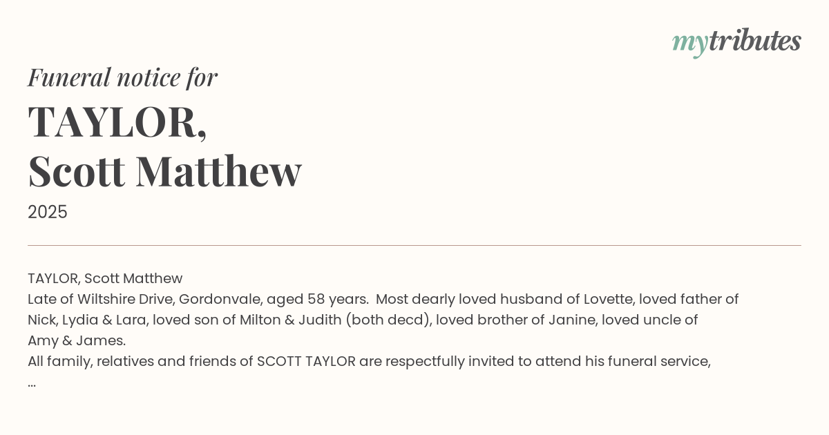 All family, relatives and friends of SCOTT TAYLOR are respectfully invited to attend his funeral service, which will be held on MONDAY MORNING 5th January 2026, commencing at 10.00am in the Chapel of Heritage Brady Funeral Directors 76 Maher Road, Gordonvale, followed by interment at the Gordonvale Lawn Cemetery.