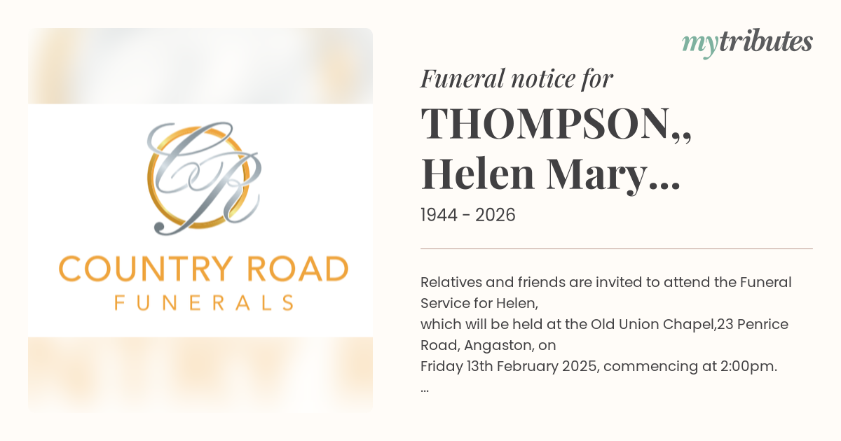 12°CRelatives and friends are invited to attend the Funeral Service for Helen,