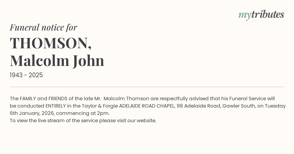 12°CThe FAMILY and FRIENDS of the late Mr. Malcolm Thomson are respectfully advised that his Funeral Service will be conducted ENTIRELY in the Taylor & Forgie ADELAIDE ROAD CHAPEL, 98 Adelaide Road, Gawler South, on Tuesday 6th January, 2026, commencing at 2pm.