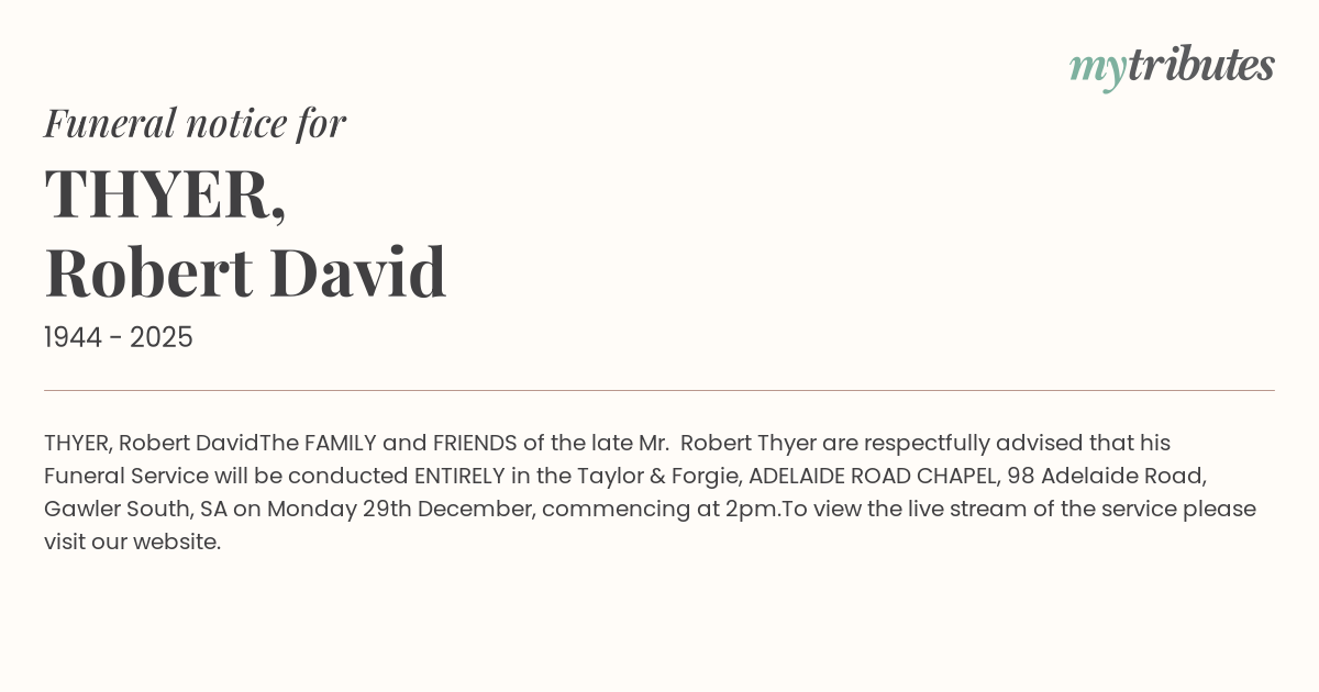 The FAMILY and FRIENDS of the late Mr. Robert Thyer are respectfully advised that his Funeral Service will be conducted ENTIRELY in the Taylor & Forgie, ADELAIDE ROAD CHAPEL, 98 Adelaide Road,