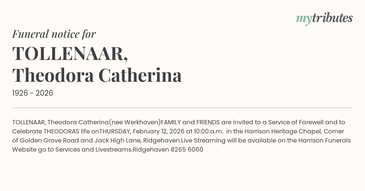 THURSDAY, February 12, 2026 at 10:00.a.m. in the Harrison Heritage Chapel, Corner of Golden Grove Road and Jack High Lane, Ridgehaven.