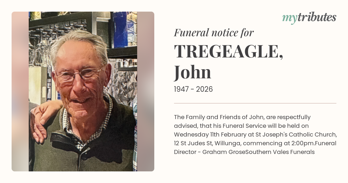 12°CThe Family and Friends of John, are respectfully advised, that his Funeral Service will be held on Wednesday 11th February at St Joseph's Catholic Church, 12 St Judes St, Willunga, commencing at 2:00pm.