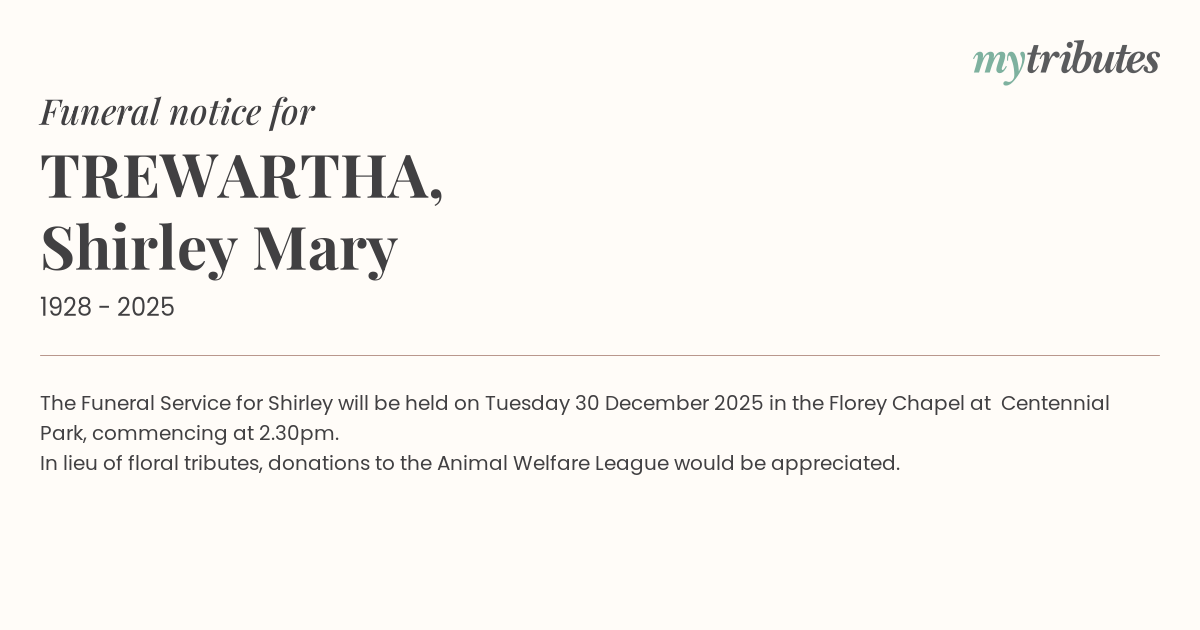 12°CThe Funeral Service for Shirley will be held on Tuesday 30 December 2025 in the Florey Chapel at Centennial Park, commencing at 2.30pm.