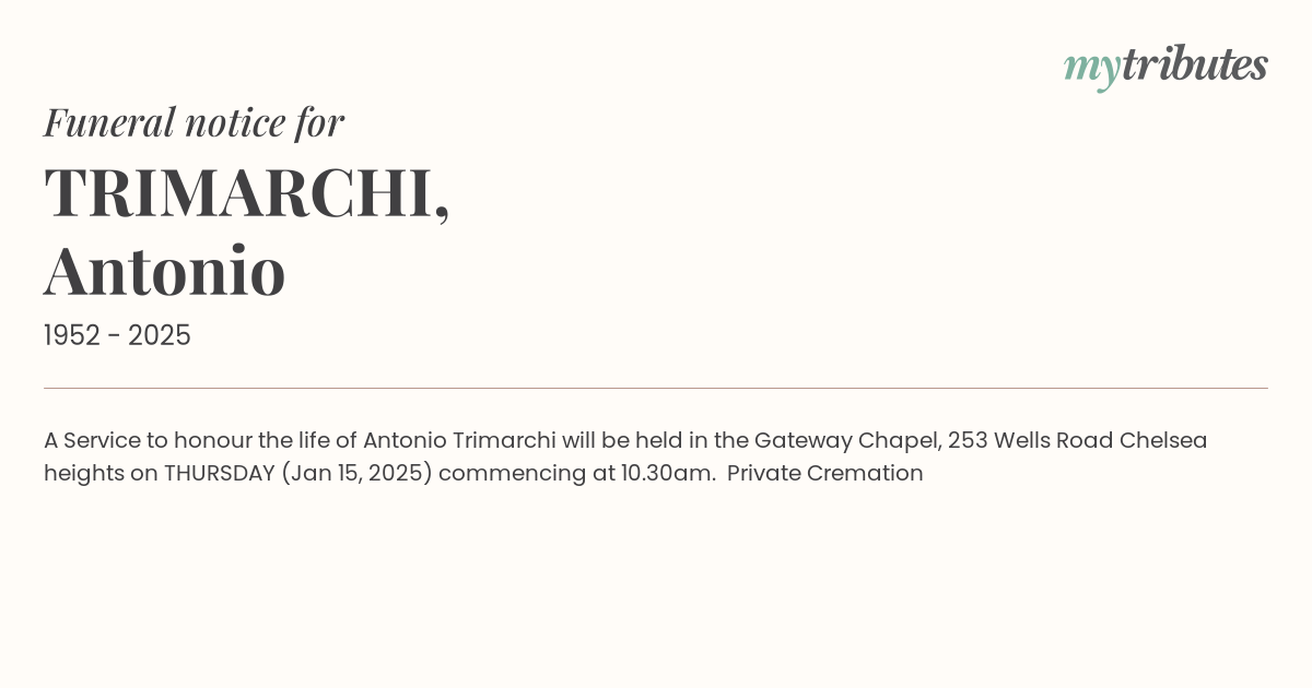 12°CA Service to honour the life of Antonio Trimarchi will be held in the Gateway Chapel, 253 Wells Road Chelsea heights on THURSDAY (Jan 15, 2025) commencing at 10.30am. Private Cremation