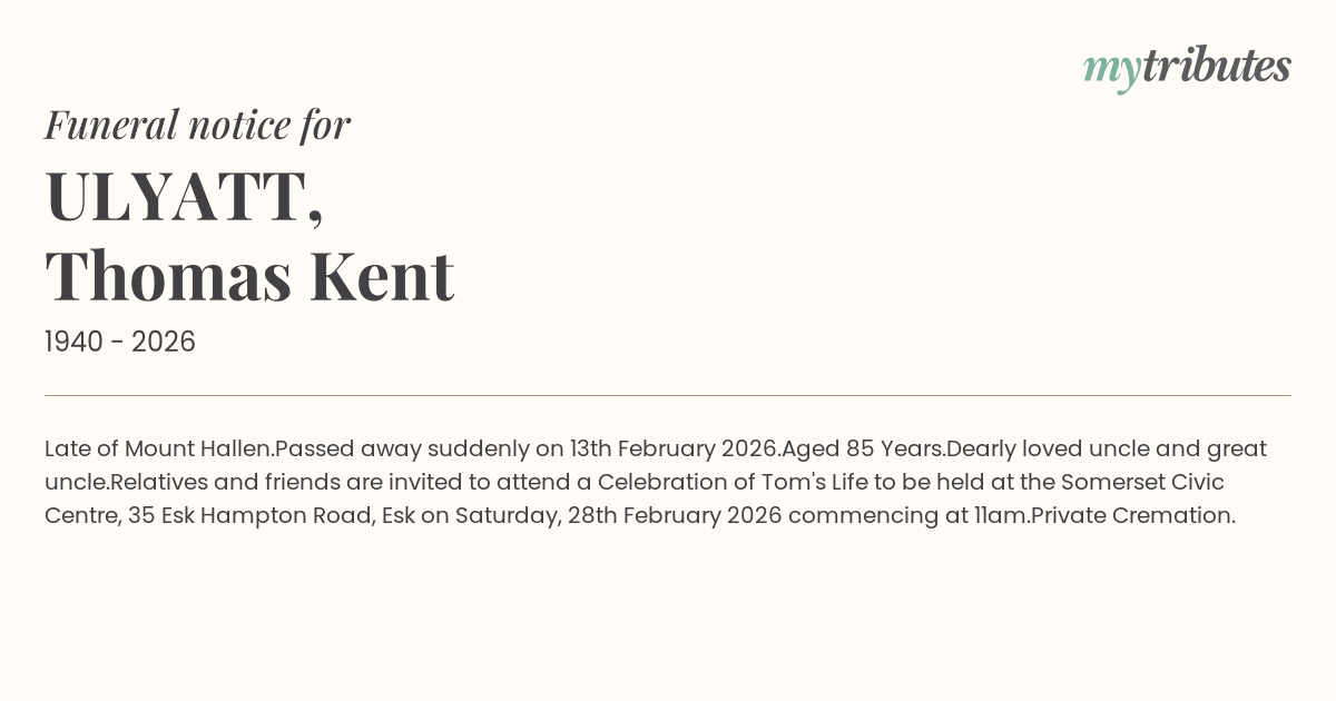Relatives and friends are invited to attend a Celebration of Tom's Life to be held at the Somerset Civic Centre, 35 Esk Hampton Road, Esk on Saturday, 28th February 2026 commencing at 11am.