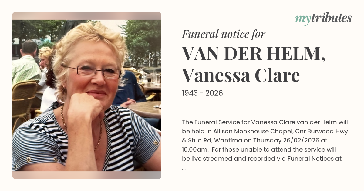 12°CThe Funeral Service for Vanessa Clare van der Helm will be held in Allison Monkhouse Chapel, Cnr Burwood Hwy & Stud Rd, Wantirna on Thursday 26/02/2026 at 10.00am.