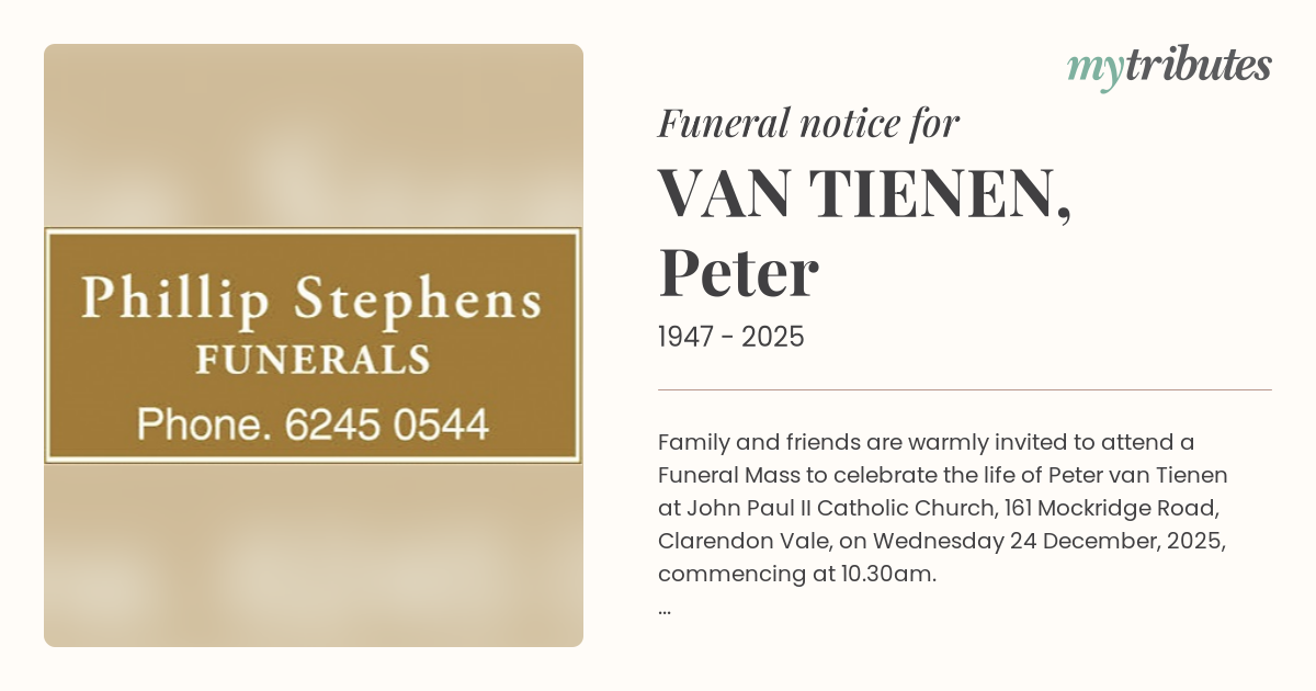 12°CFamily and friends are warmly invited to attend a Funeral Mass to celebrate the life of Peter van Tienen at John Paul II Catholic Church, 161 Mockridge Road, Clarendon Vale, on Wednesday 24 December, 2025, commencing at 10.30am.