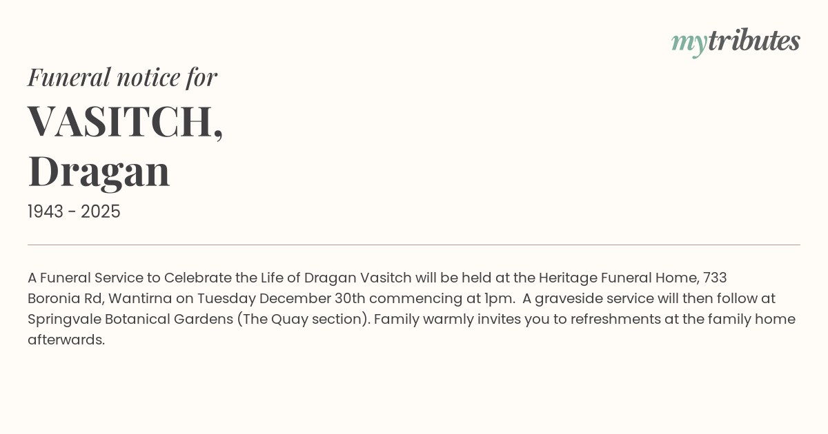 12°CA Funeral Service to Celebrate the Life of Dragan Vasitch will be held at the Heritage Funeral Home, 733 Boronia Rd, Wantirna on Tuesday December 30th commencing at 1pm. A graveside service will then follow at Springvale Botanical Gardens (The Quay section). Family warmly invites you to refreshments at the family home afterwards.