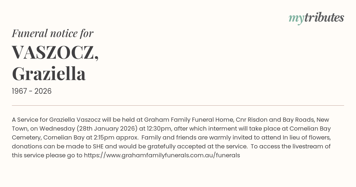 12°CA Service for Graziella Vaszocz will be held at Graham Family Funeral Home, Cnr Risdon and Bay Roads, New Town, on Wednesday (28th January 2026) at 12:30pm, after which interment will take place at Cornelian Bay Cemetery, Cornelian Bay at 2:15pm approx. Family and friends are warmly invited to attend In lieu of flowers, donations can be made to SHE and would be gratefully accepted at the service. To access the livestream of this service please go to https://www.grahamfamilyfunerals.com.au/funerals