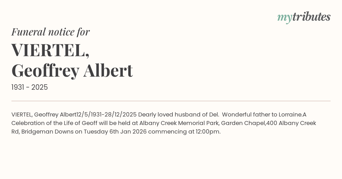 A Celebration of the Life of Geoff will be held at Albany Creek Memorial Park, Garden Chapel,