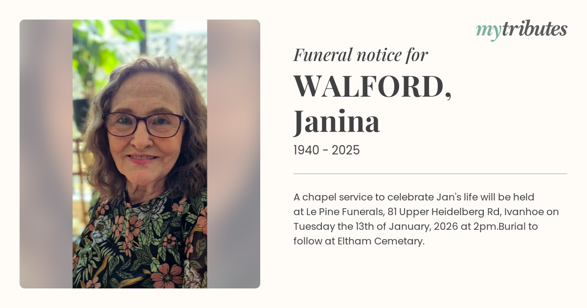 12°CA chapel service to celebrate Jan's life will be held at Le Pine Funerals, 81 Upper Heidelberg Rd, Ivanhoe on Tuesday the 13th of January, 2026 at 2pm.