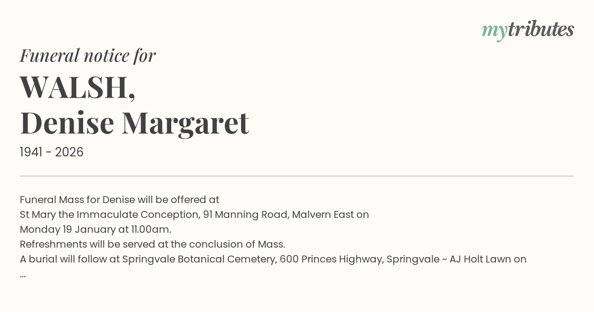 A burial will follow at Springvale Botanical Cemetery, 600 Princes Highway, Springvale ~ AJ Holt Lawn on Tuesday 20 January at 10.00am.