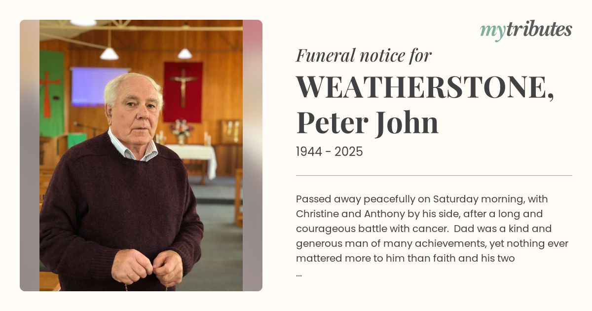 Requiem Mass for Peter John Weatherstone will be held on Thursday, 8 January 2026 at 1:00 pm at The Church of the Nativity,