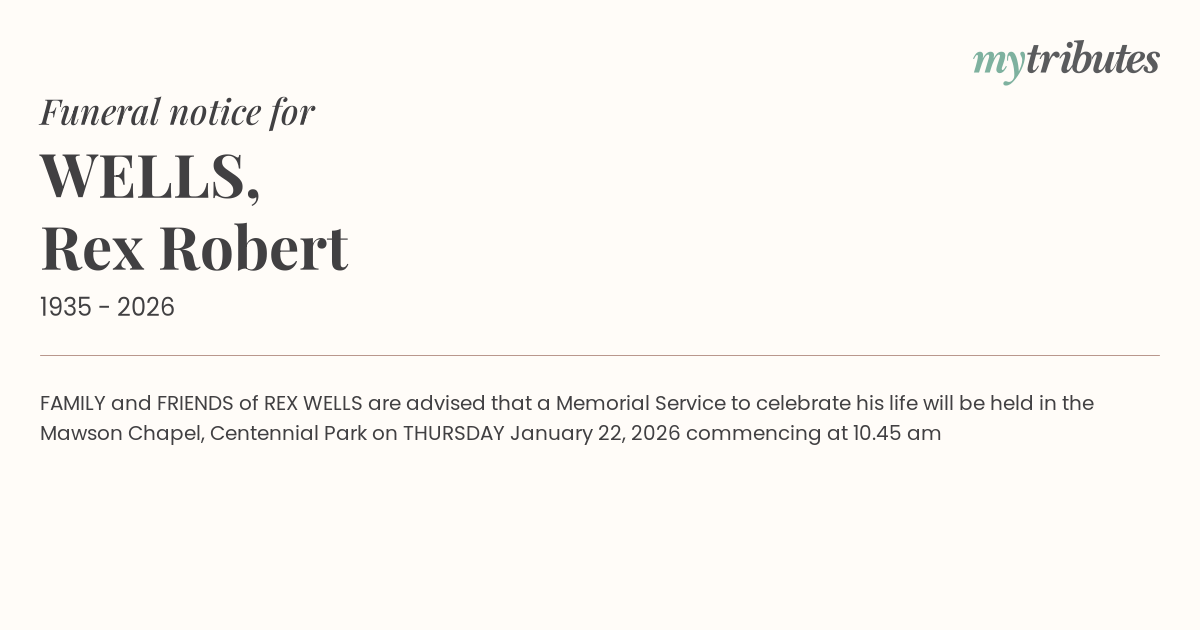 12°CFAMILY and FRIENDS of REX WELLS are advised that a Memorial Service to celebrate his life will be held in the Mawson Chapel, Centennial Park on THURSDAY January 22, 2026 commencing at 10.45 am