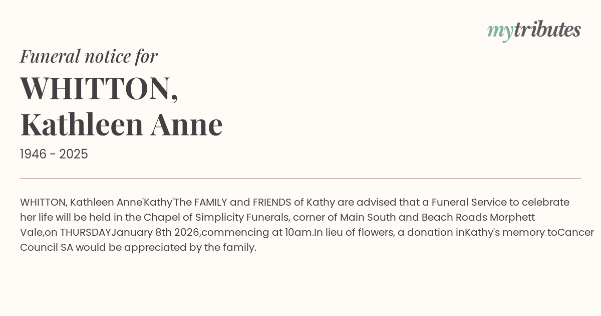 The FAMILY and FRIENDS of Kathy are advised that a Funeral Service to celebrate her life will be held in the Chapel of Simplicity Funerals, corner of Main South and Beach Roads Morphett Vale,