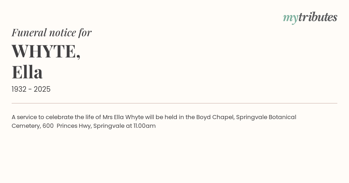 12°CA service to celebrate the life of Mrs Ella Whyte will be held in the Boyd Chapel, Springvale Botanical Cemetery, 600 Princes Hwy, Springvale at 11.00am