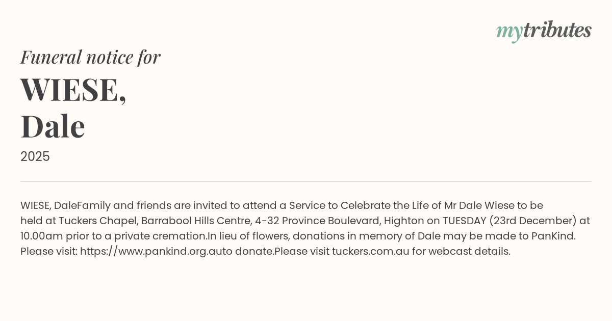 Mr Dale Wiese to be held at Tuckers Chapel, Barrabool Hills Centre, 4-32 Province Boulevard, Highton on TUESDAY (23rd December) at 10.00am prior to a private cremation.