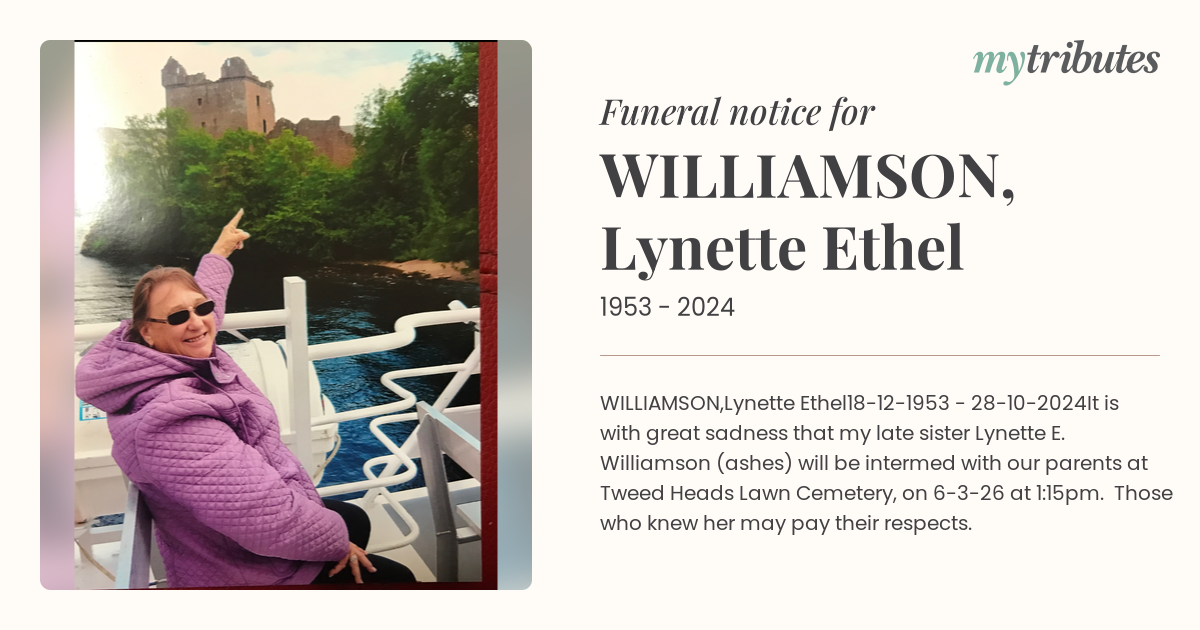 It is with great sadness that my late sister Lynette E. Williamson (ashes) will be intermed with our parents at Tweed Heads Lawn Cemetery, on 6-3-26 at 1:15pm. Those who knew her may pay their respects.
