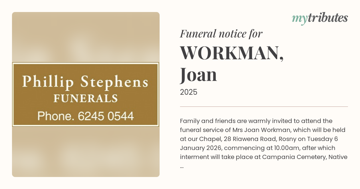 12°CFamily and friends are warmly invited to attend the funeral service of Mrs Joan Workman, which will be held at our Chapel, 28 Riawena Road, Rosny on Tuesday 6 January 2026, commencing at 10.00am, after which interment will take place at Campania Cemetery, Native Corners Road, Campania at 12.30pm approx.
