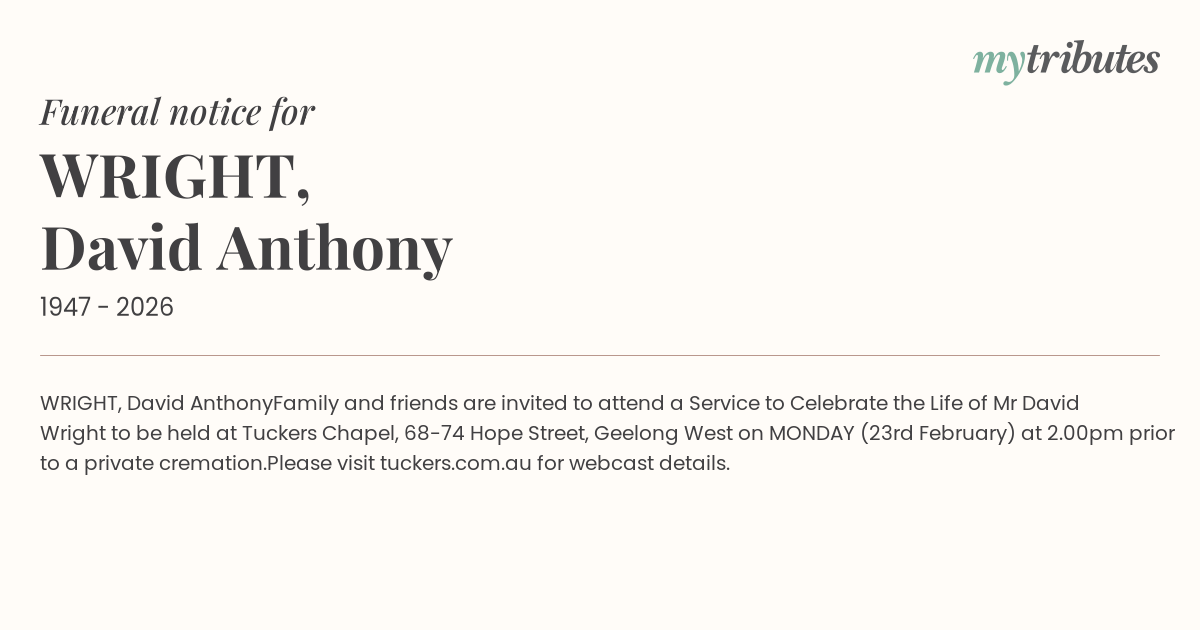 Mr David Wright to be held at Tuckers Chapel, 68-74 Hope Street, Geelong West on MONDAY (23rd February) at 2.00pm prior to a private cremation.