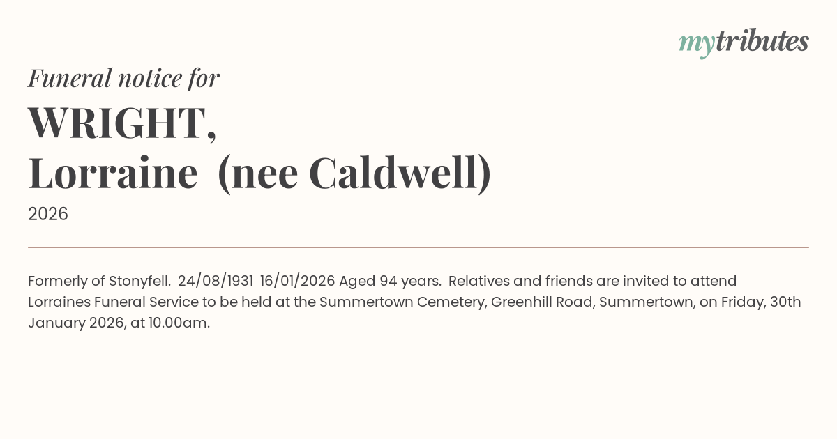 12°CFormerly of Stonyfell. 24/08/1931 – 16/01/2026 Aged 94 years. Relatives and friends are invited to attend Lorraine’s Funeral Service to be held at the Summertown Cemetery, Greenhill Road, Summertown, on Friday, 30th January 2026, at 10.00am.