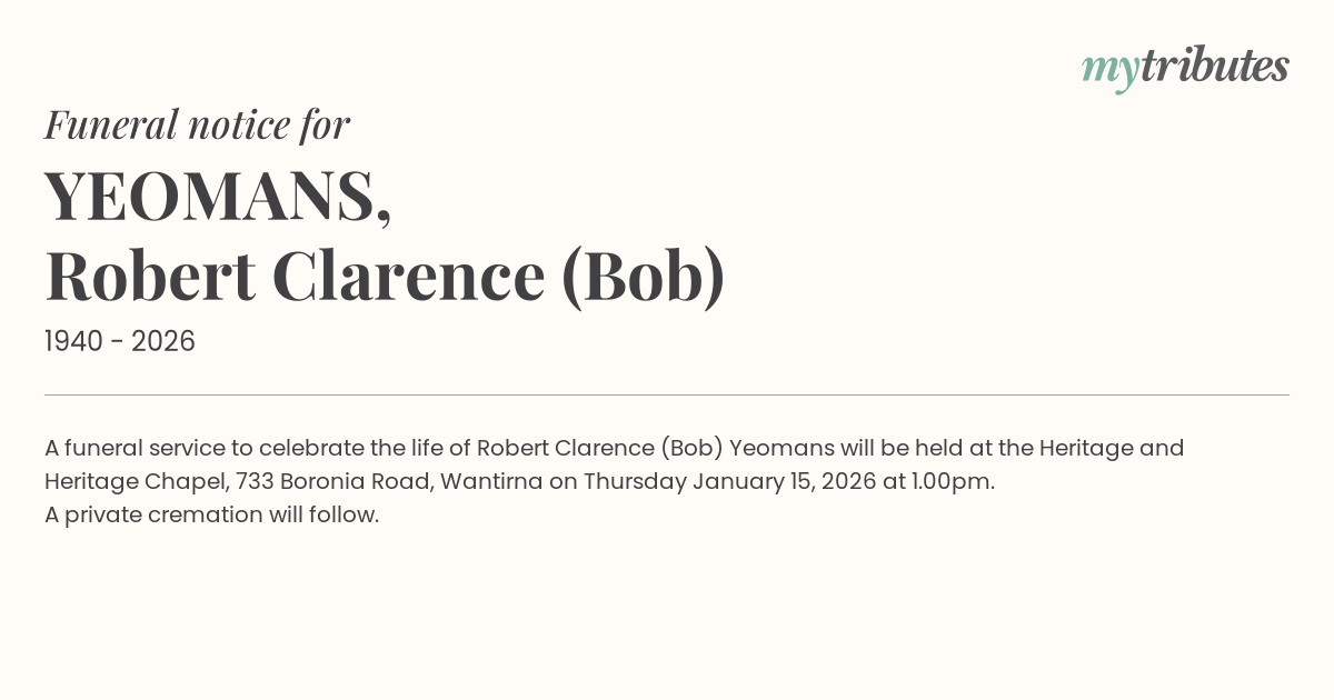 12°CA funeral service to celebrate the life of Robert Clarence (Bob) Yeomans will be held at the Heritage and Heritage Chapel, 733 Boronia Road, Wantirna on Thursday January 15, 2026 at 1.00pm.