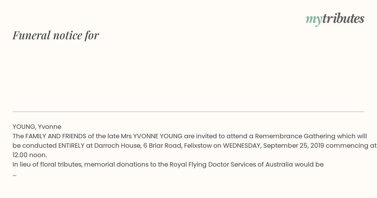 The FAMILY AND FRIENDS of the late Mrs YVONNE YOUNG are invited to attend a Remembrance Gathering which will be conducted ENTIRELY at Darroch House, 6 Briar Road, Felixstow on WEDNESDAY, September 25, 2019 commencing at 12.00 noon.