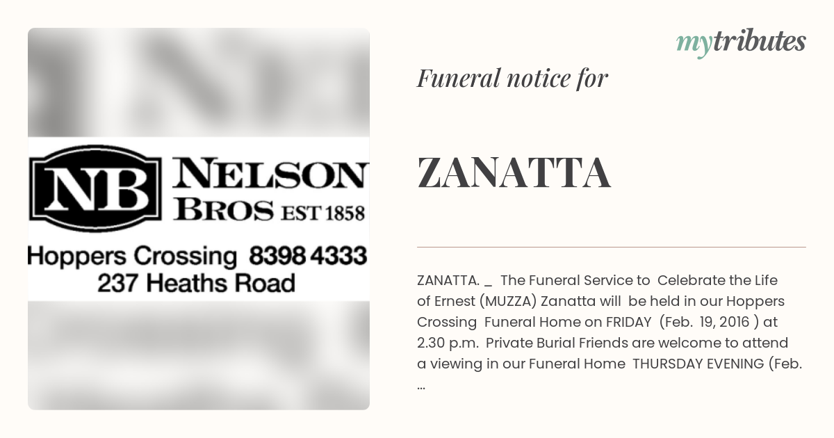 12°CZANATTA. _ The Funeral Service to Celebrate the Life of Ernest (MUZZA) Zanatta will be held in our Hoppers Crossing Funeral Home on FRIDAY (Feb. 19, 2016 ) at 2.30 p.m. Private Burial Friends are welcome to attend a viewing in our Funeral Home THURSDAY EVENING (Feb. 18, 2016) from 7 - 8 p.m., thank you.