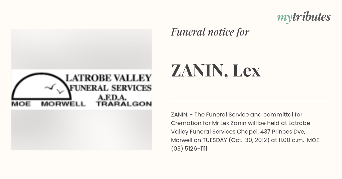 12°CZANIN. - The Funeral Service and committal for Cremation for Mr Lex Zanin will be held at Latrobe Valley Funeral Services Chapel, 437 Princes Dve, Morwell on TUESDAY (Oct. 30, 2012) at 11.00 a.m. MOE (03) 5126-1111