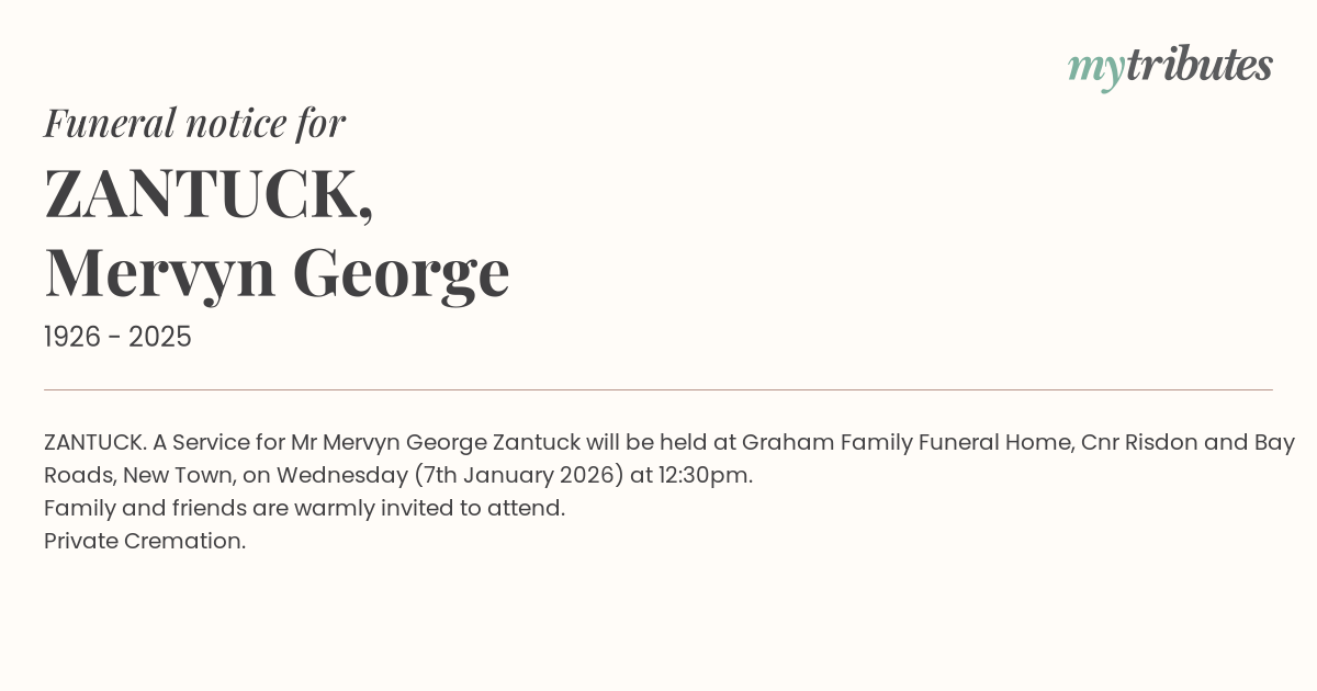 12°CZANTUCK. A Service for Mr Mervyn George Zantuck will be held at Graham Family Funeral Home, Cnr Risdon and Bay Roads, New Town, on Wednesday (7th January 2026) at 12:30pm.